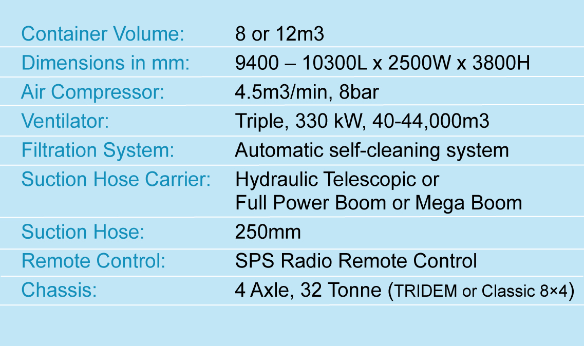 Typically mounted to a Tridem type chassis with a rear steering axle the triple fan unit is usually supplied in Dino 12 configuration with a spoil capacity 0f 12m3 and operates in three power settings. At level one this enables the unit to perform at the same levels as a Dino Twin Fan, ideal for utility service excavations and close up excavation works. Level two and three are utilised as depth and distance increases, typically on construction works and operations requiring loosened materials to be moved. These works include tunnel works, long culvert works etc.